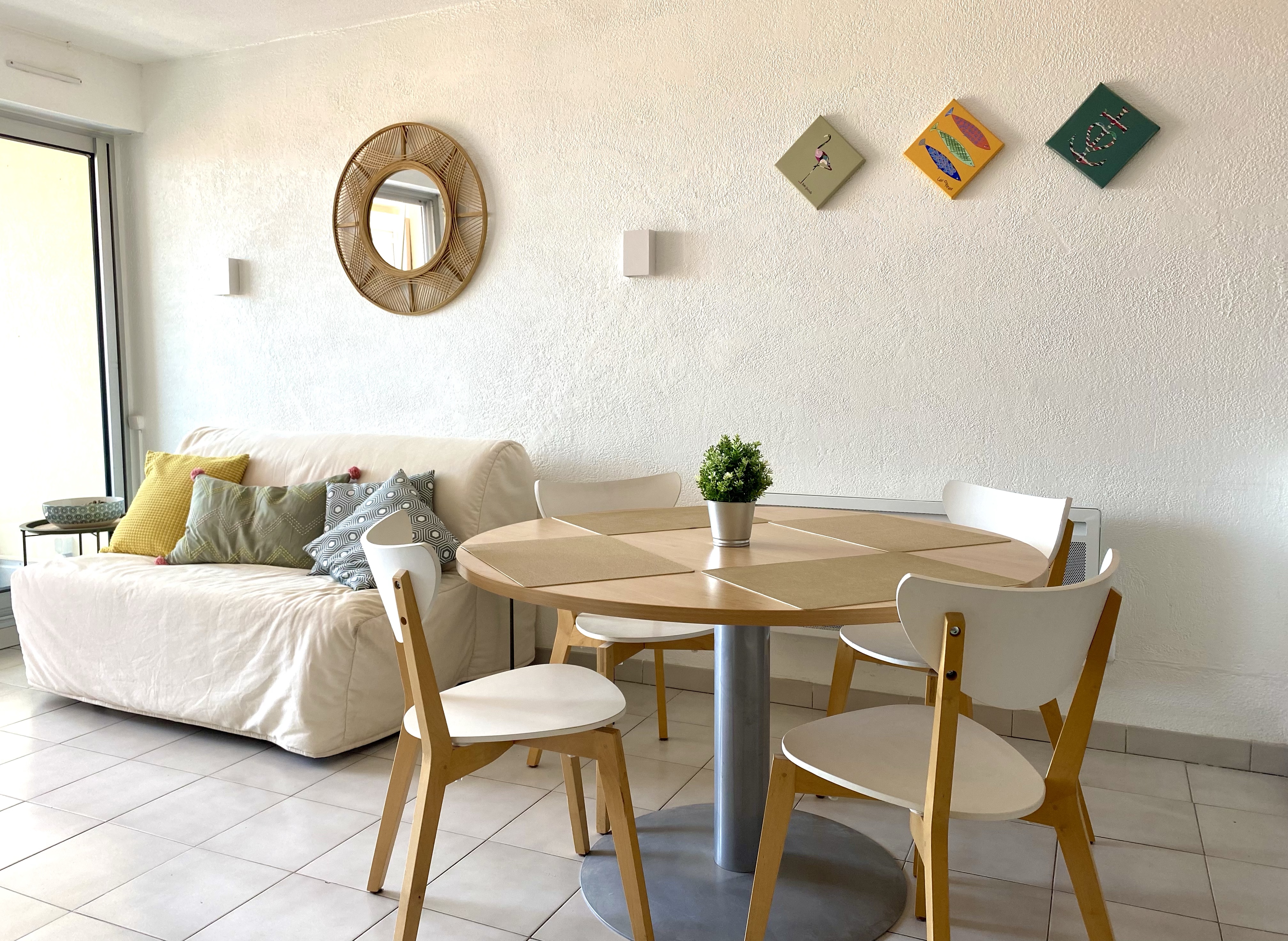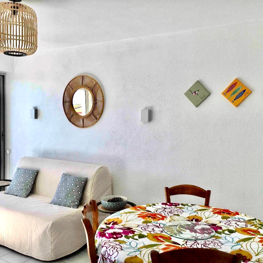 - Un grand séjour avec son espace salon donnant sur la terrasse, avec canapé convertible 2 places (140cm), télévision et chaîne hi-fi, et un espace salle à manger avec une table et 4 chaises.