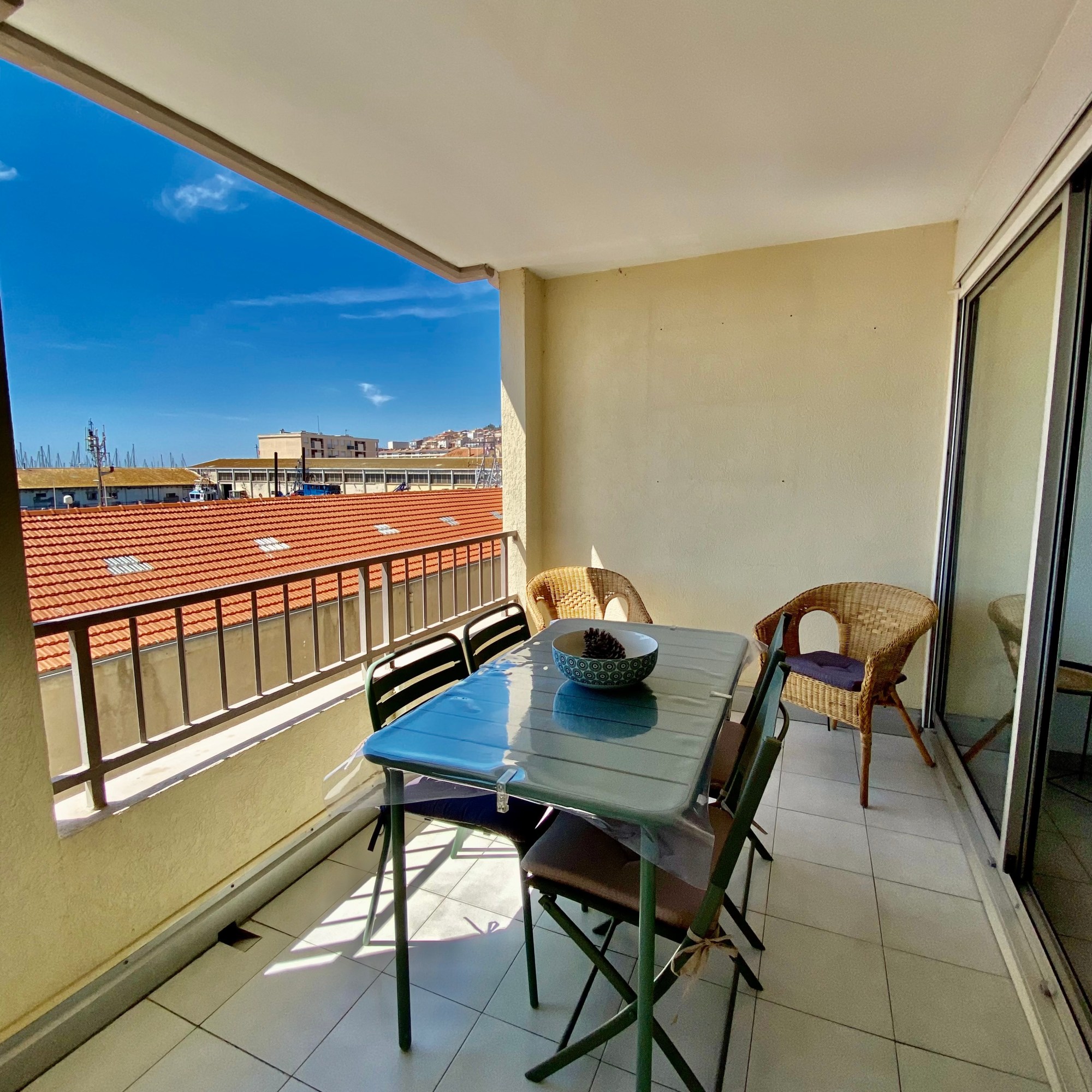 Point fort de l’appartement : La terrasse de 10m2 est exposée plein sud avec vue sur le port, le phare Saint-Louis et la mer Méditerranée. Equipée de 1 table, 4 chaises, parasol et 2 sièges-transats, ainsi qu’une plancha électrique.
