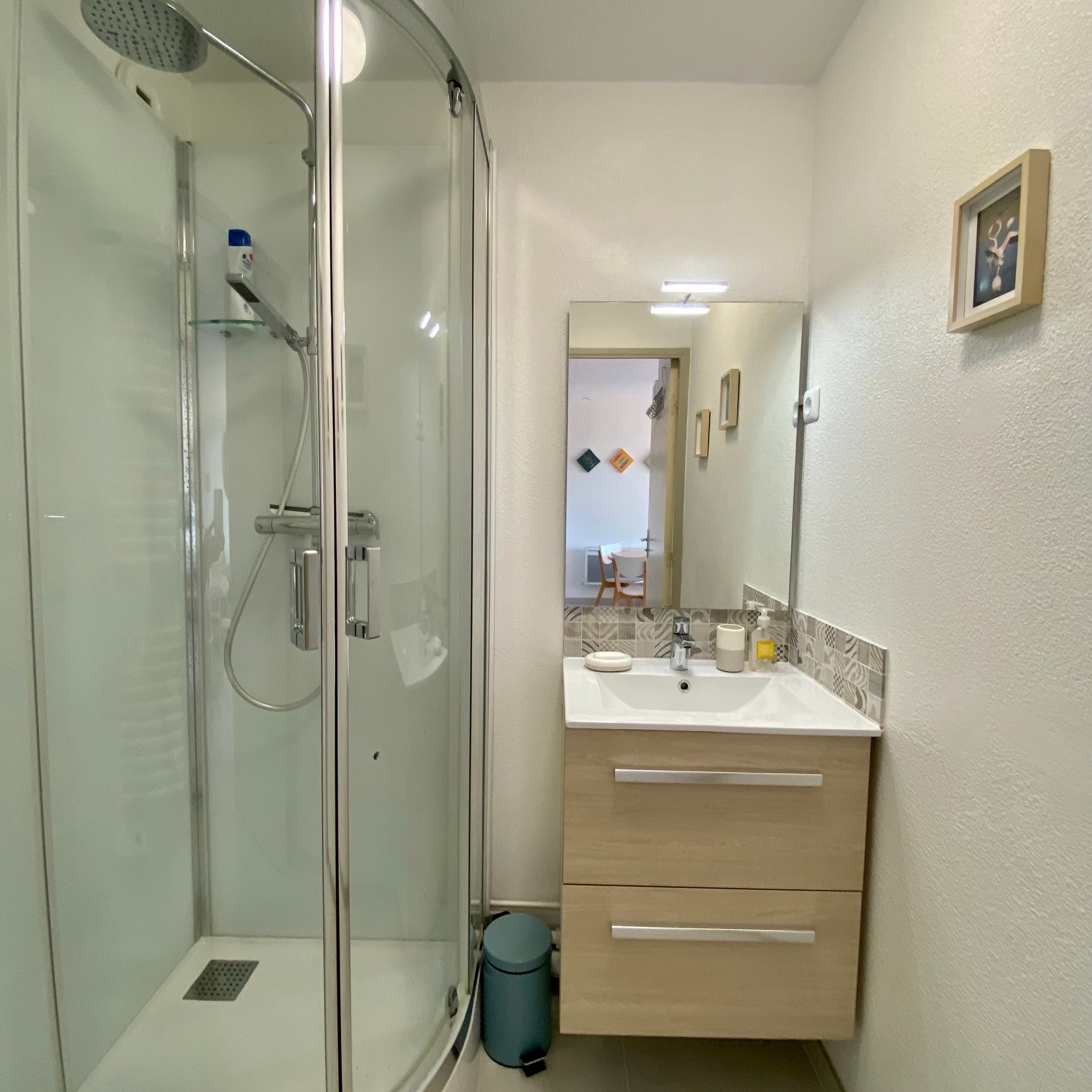 - Une salle de douche neuve, avec meuble vasque, cabine de douche. Un sèche-cheveux est à votre disposition.
