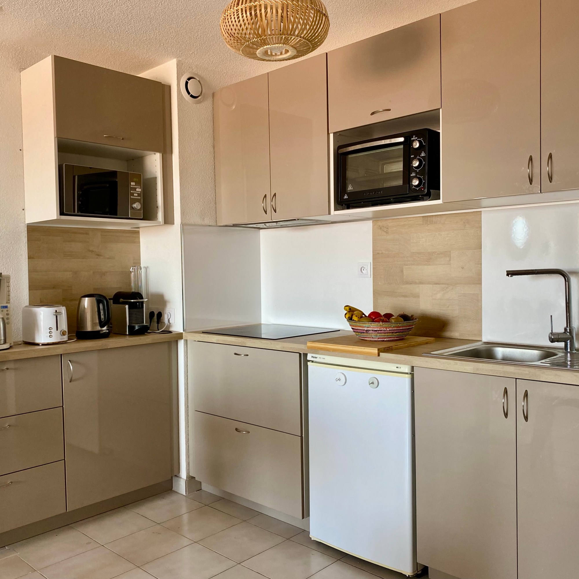 - Une cuisine équipée semi-ouverte avec plaque de cuisson, four, réfrigérateur, micro-ondes, grille-pain et cafetière Nespresso. Vous disposez de toute la vaisselle, des ustensiles de cuisine nécessaires, casseroles et poêles.